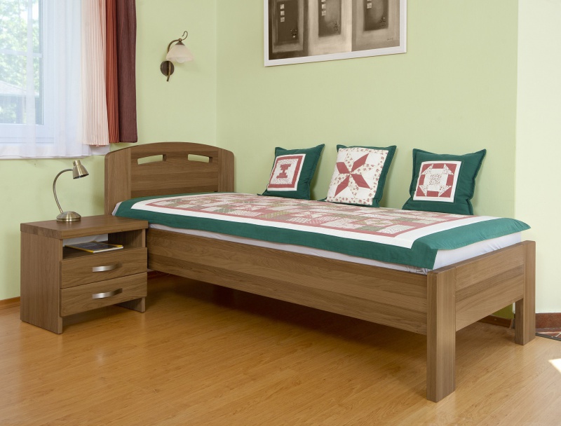 Jednolůžko Orion buk čelo č.1 barva ořech. Příslušenství - noční stolek Orion se dvěma zásuvkami, deska na zeď. Koupit