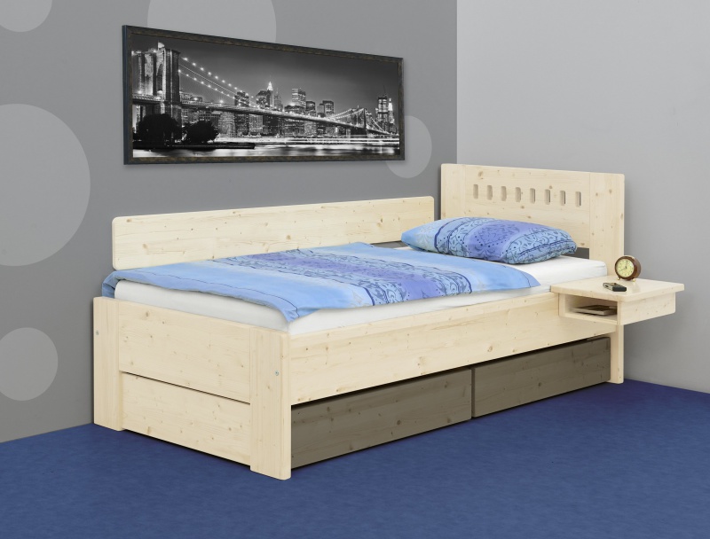 Jednolůžko Orion smrk čelo č.4 barva bílá. Příslušenství - závěsný noční stolek s nikou, zábrana v předním čele, deska na zeď, zásuvky pod postel barva šedá. Koupit